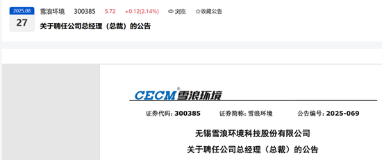 2025-08-27雪浪环境:关于聘任公司总经理(总裁)的公告