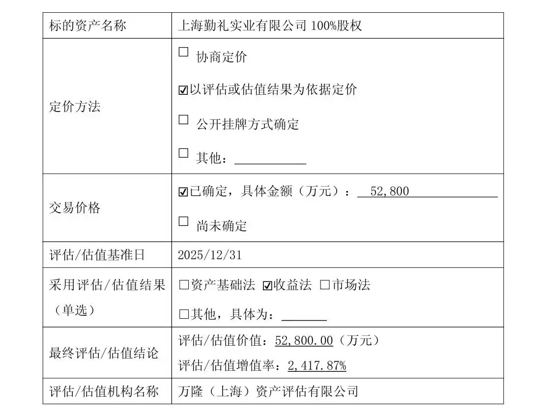 公告显示,截至评估基准日(2025年12月31日),上海勤礼合并口径股东全部权益的账面值为2097.01万元,评估值为5.28亿元,评估增值5.07亿元。